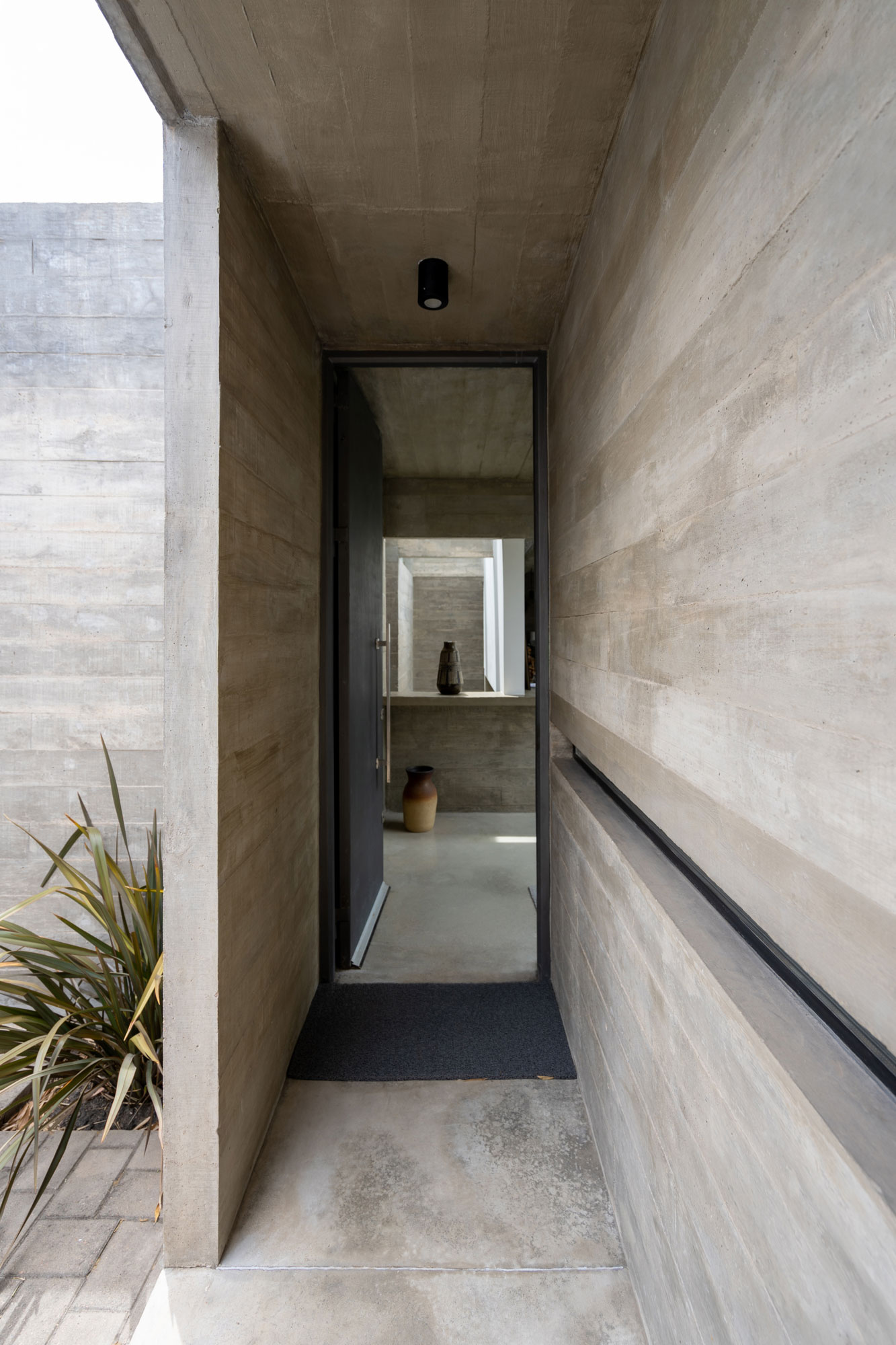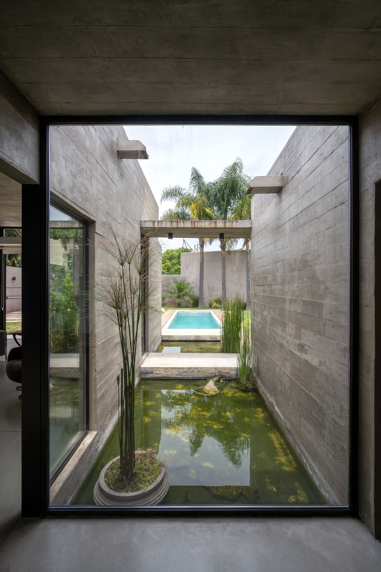 With all this carefully prepared material, a cordial meeting with the owners, and a visit to the site, our proposal was for a house that detaches itself from the existing wall and, at the same time, underpins it with a system that combines columns, beams, and slabs. This creates an outdoor space with vegetation that provides privacy and sound insulation for the three bedrooms. Access to the house is through the garage. From the entrance hall, there are views of a pond that extends into the pool and a corridor with overhead lighting that separates the social area from the bedrooms. A small patio, an extension of the garden that isolates the house from the public road, helps to reinforce this requirement. Separate, although directly accessible from the entrance, is the study, soundproofed from the rest of the house by the pond and from the neighbors by an open space that connects the garage and the garden at the back of the lot.