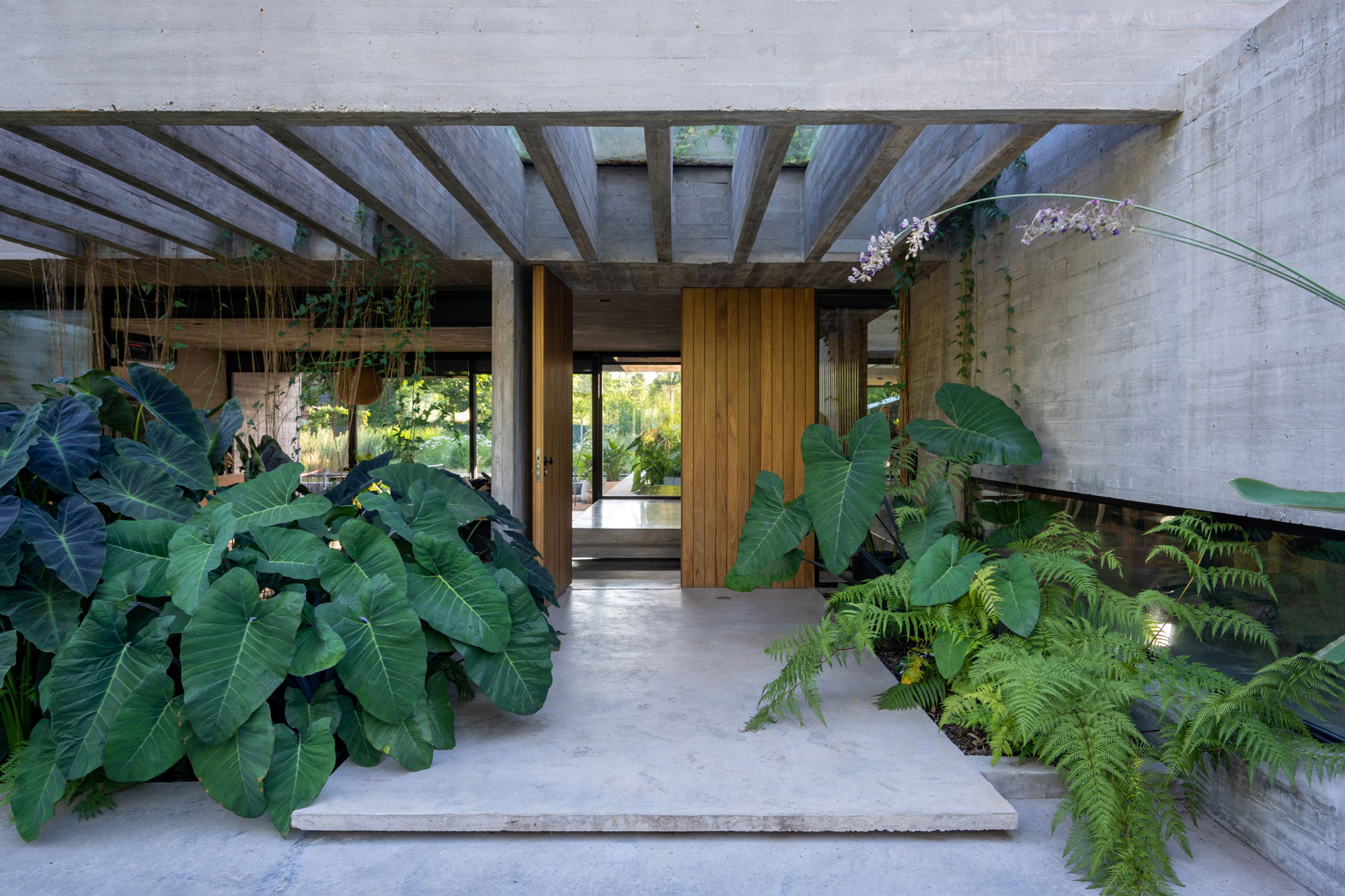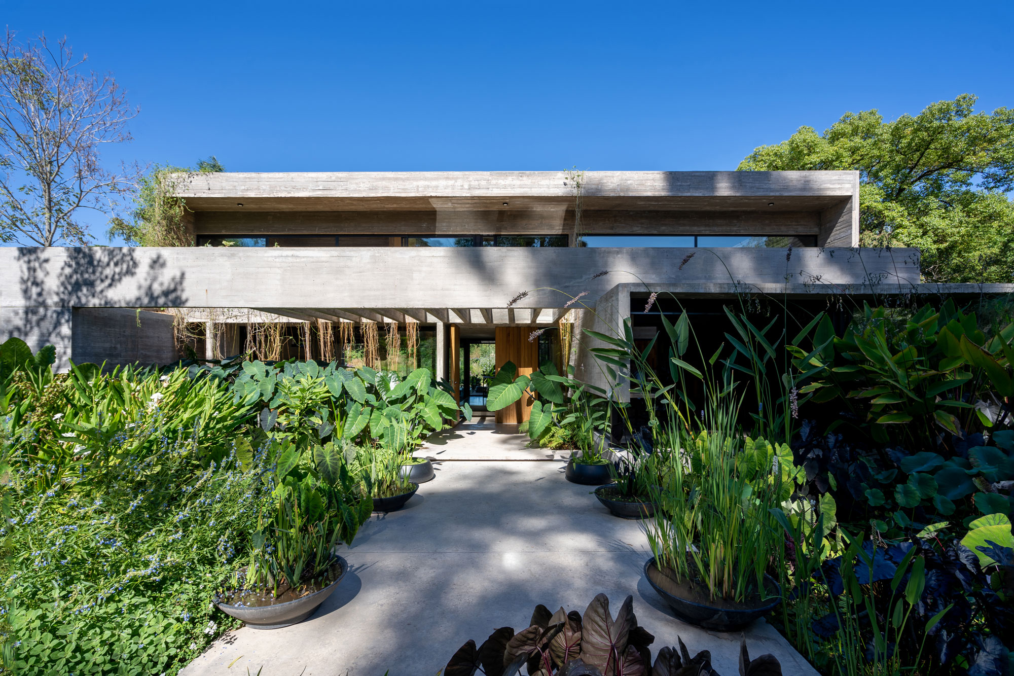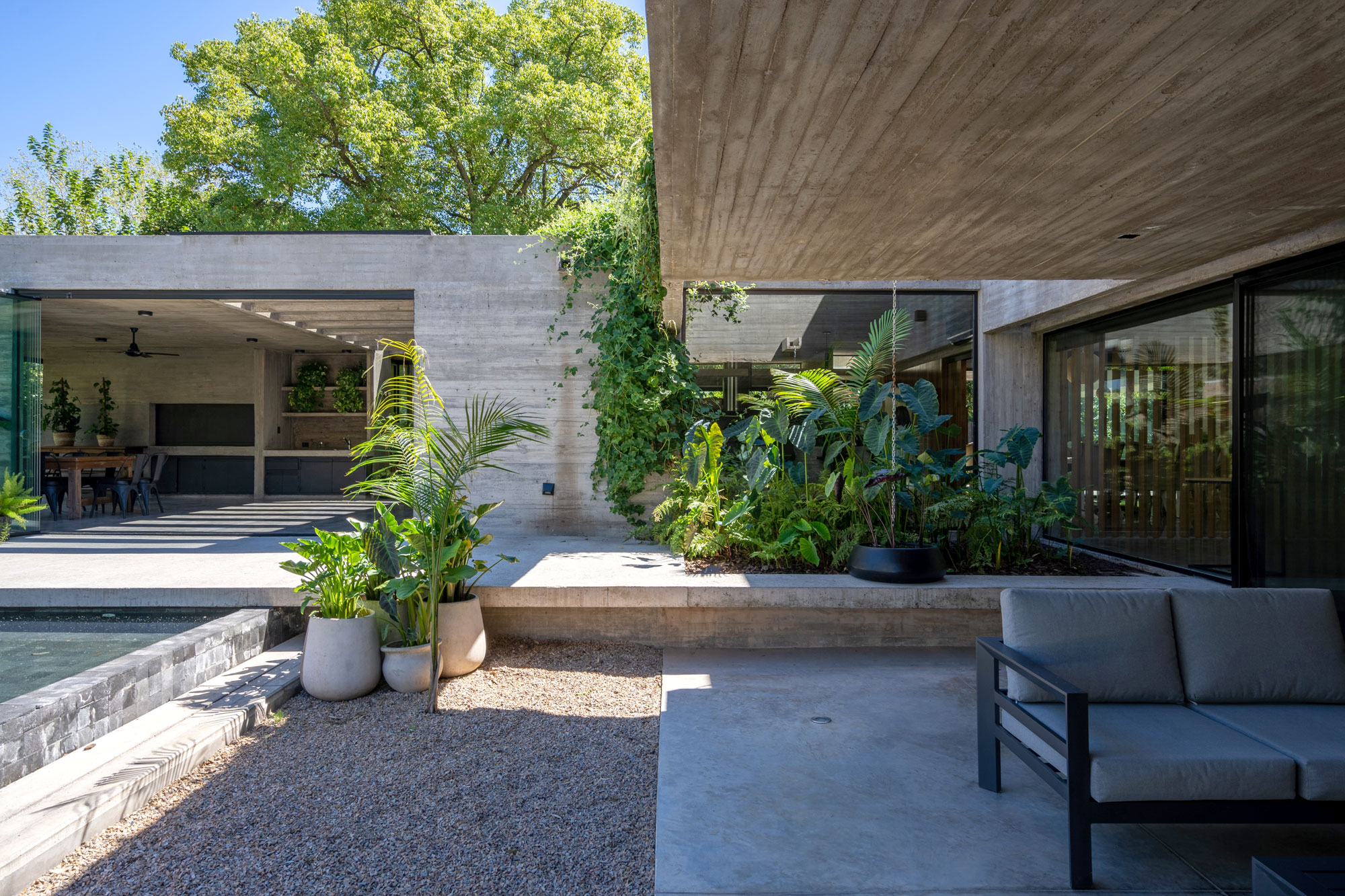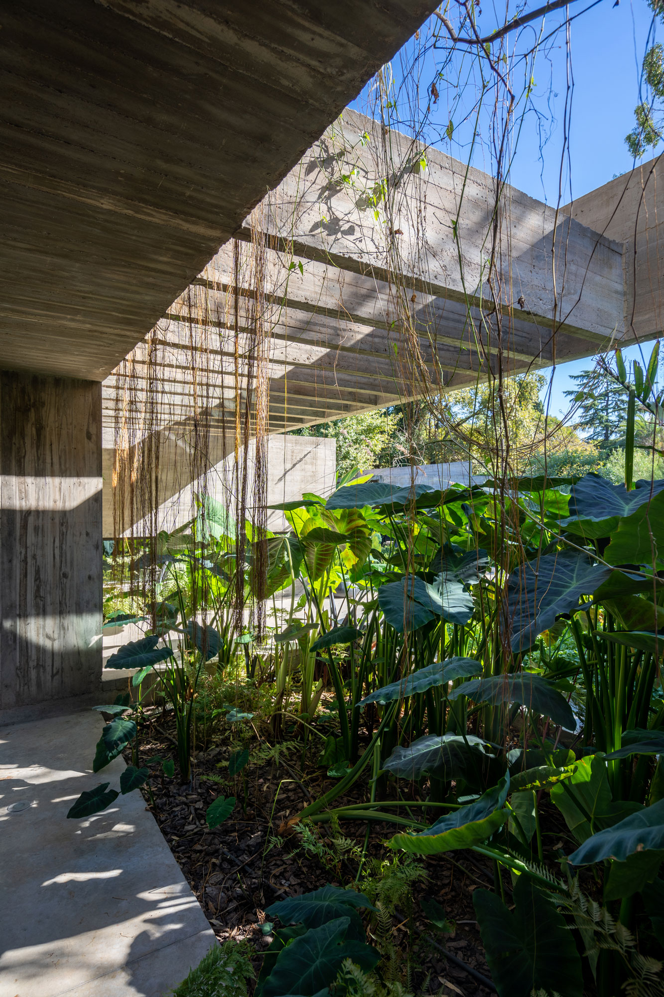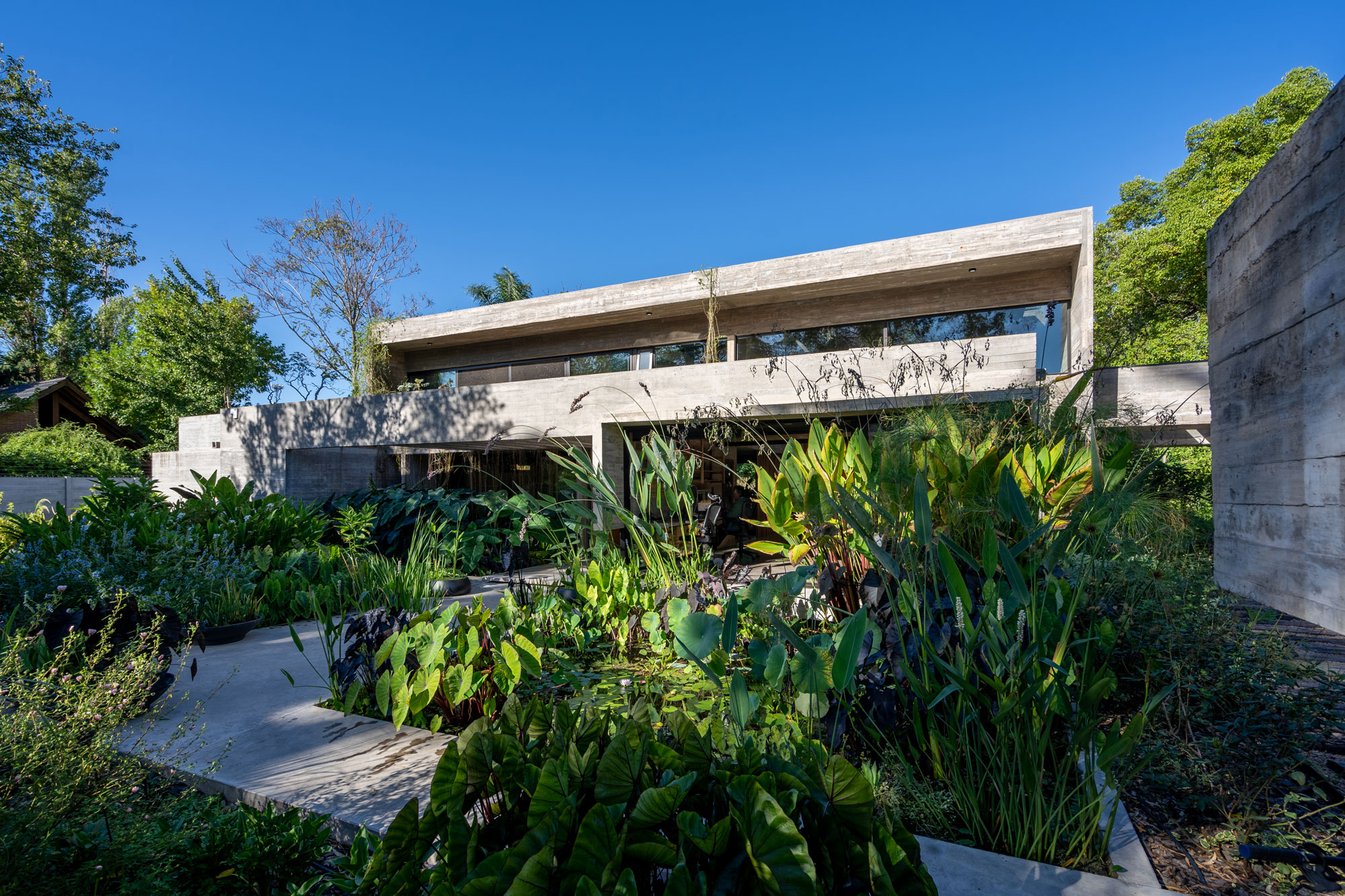 En esta obra, la arquitectura y el paisaje proyectado se funden. El proyecto no se entiende como un objeto autónomo, sino como un sistema de mediaciones donde el verde no es un ornamento, sino un elemento estructural que termina de construir la atmósfera del habitar. Las pérgolas, los jardines en altura y los espejos de agua interactúan con la solidez del hormigón, logrando que la vivienda se complete y cobre sentido sólo a través de su íntima relación con el entorno creado.