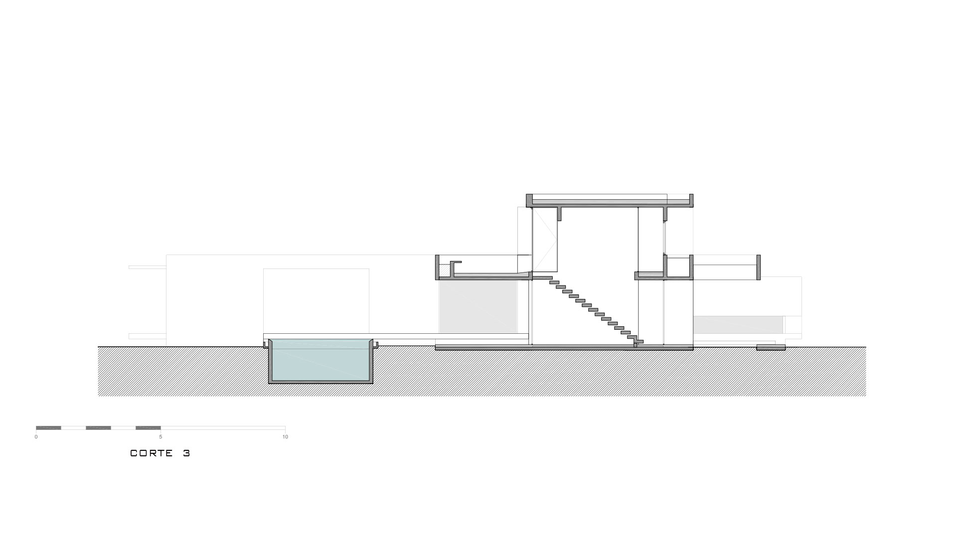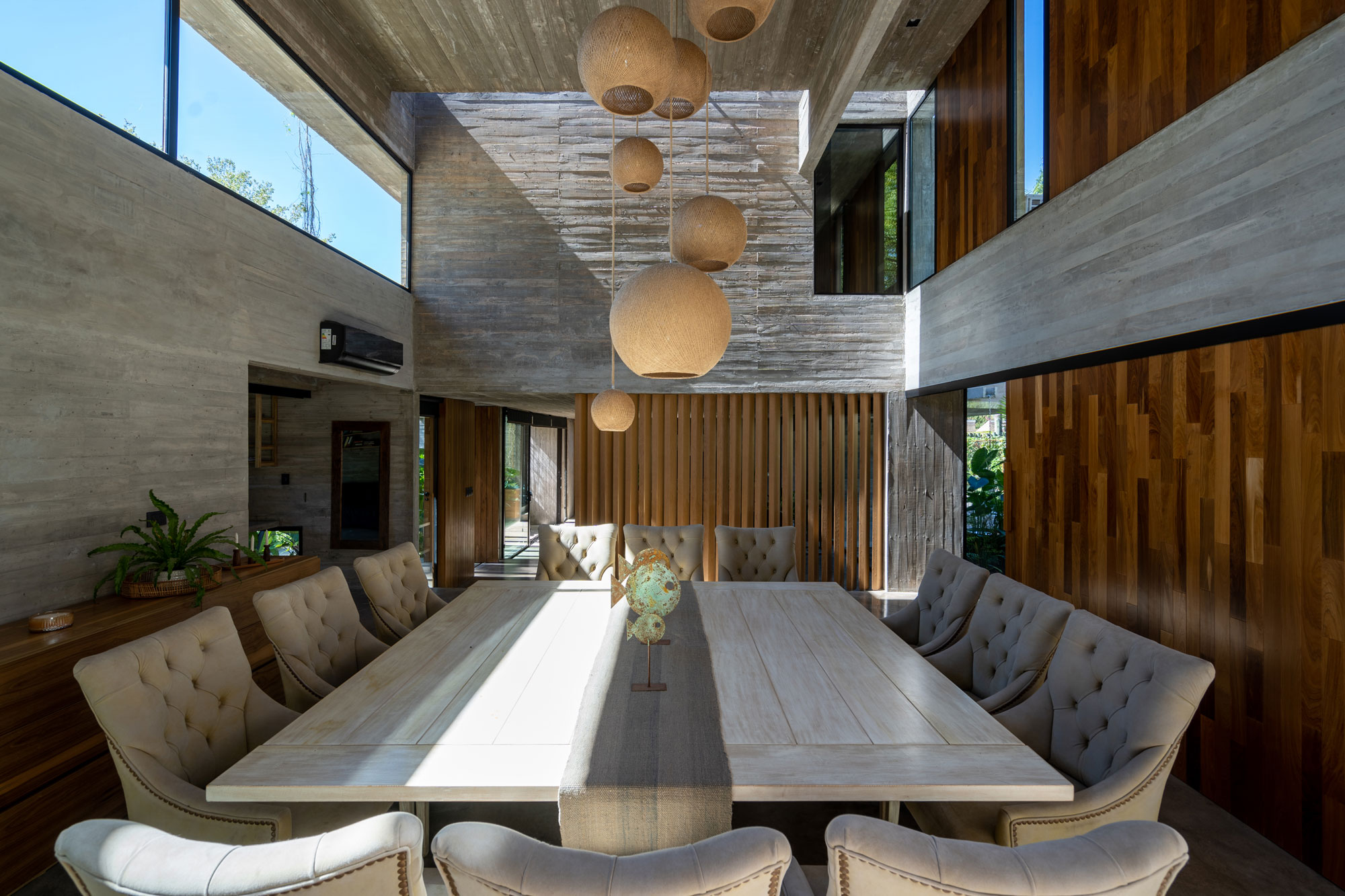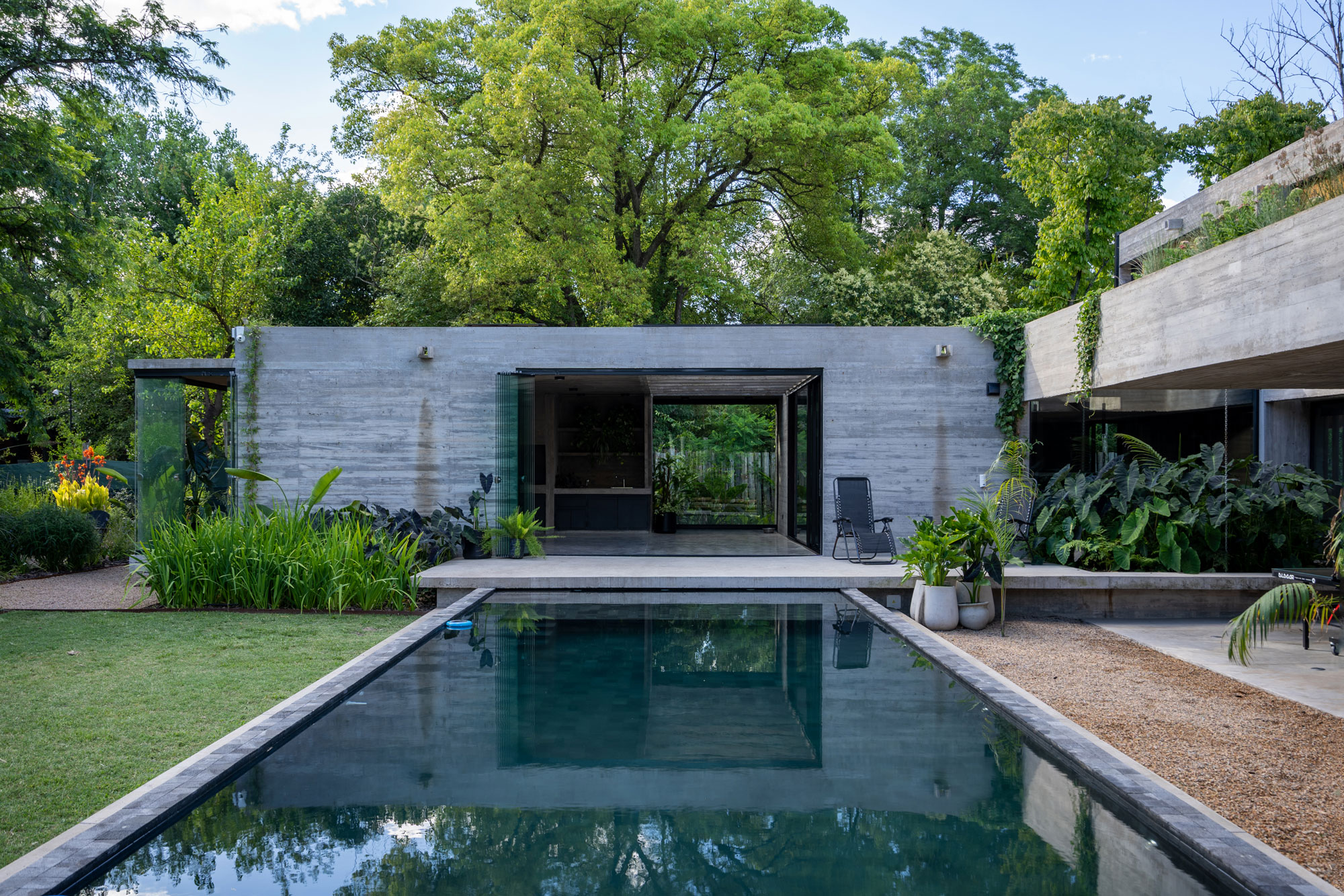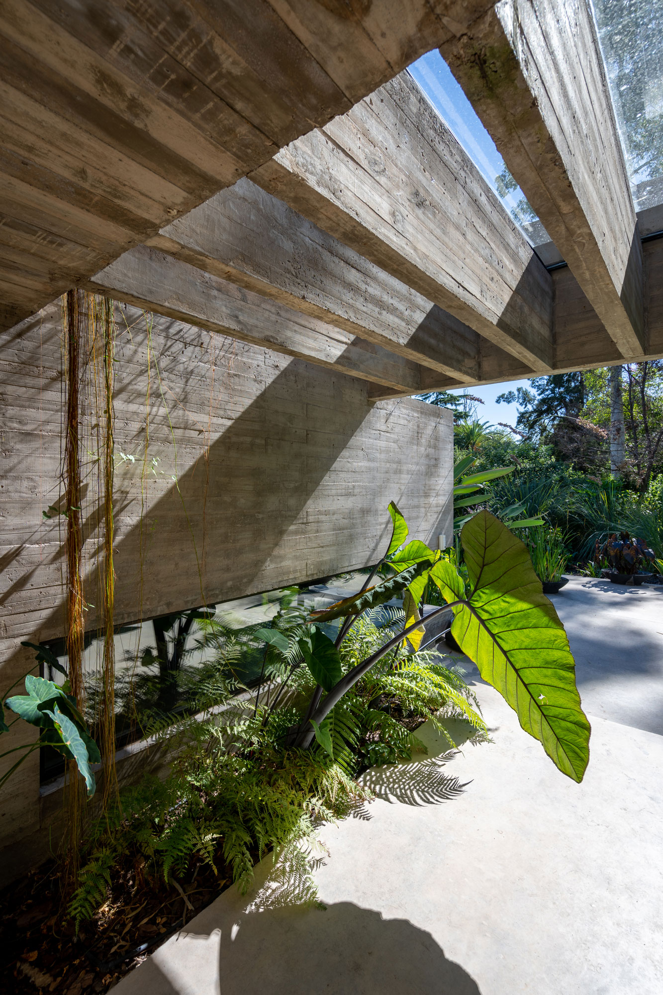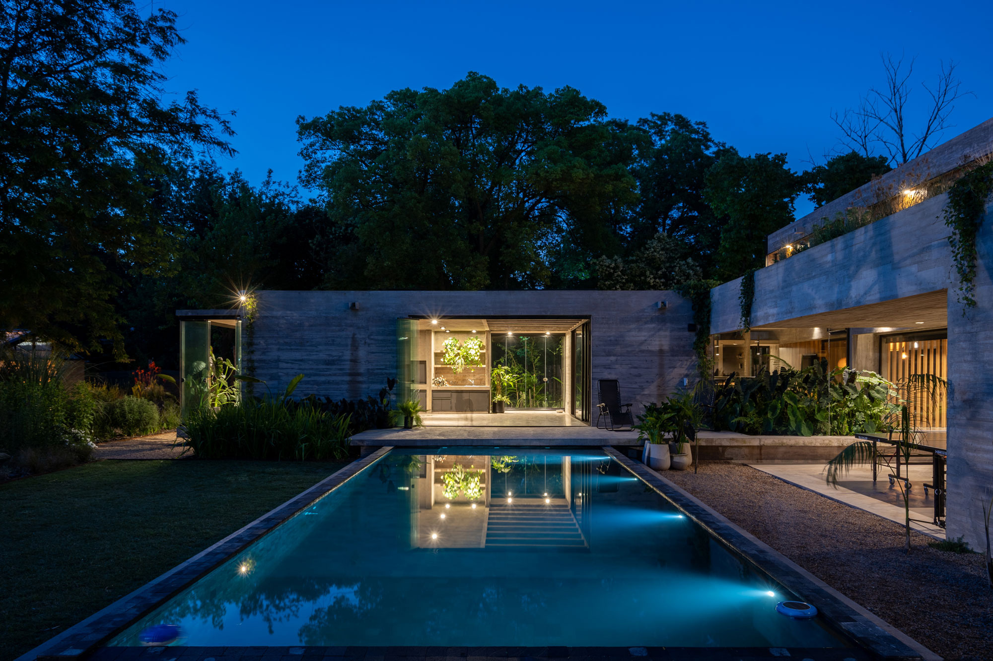 En esta obra, la arquitectura y el paisaje proyectado se funden. El proyecto no se entiende como un objeto autónomo, sino como un sistema de mediaciones donde el verde no es un ornamento, sino un elemento estructural que termina de construir la atmósfera del habitar. Las pérgolas, los jardines en altura y los espejos de agua interactúan con la solidez del hormigón, logrando que la vivienda se complete y cobre sentido sólo a través de su íntima relación con el entorno creado.
