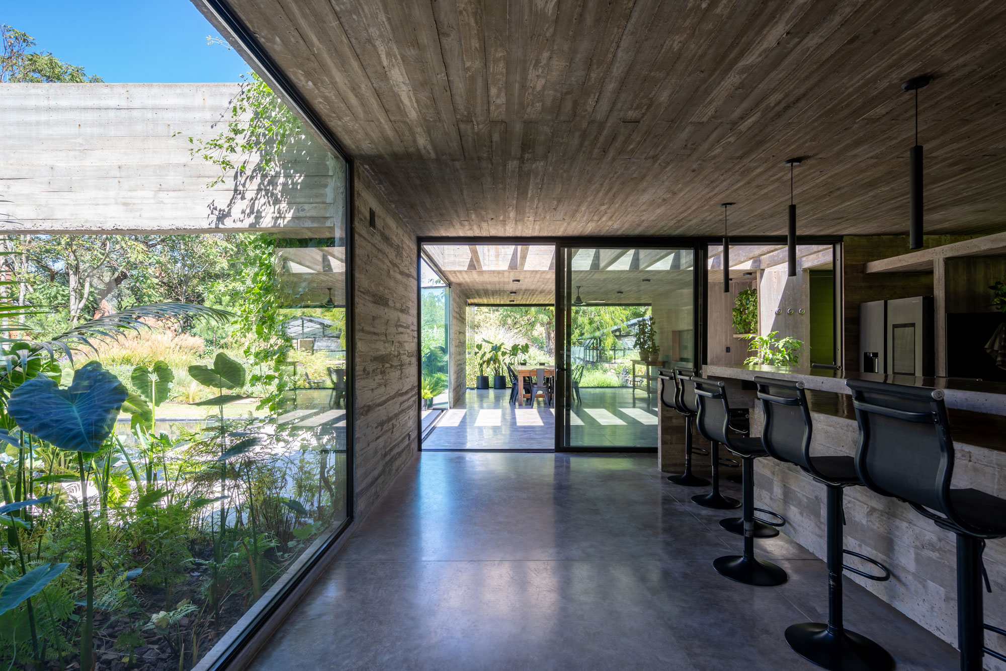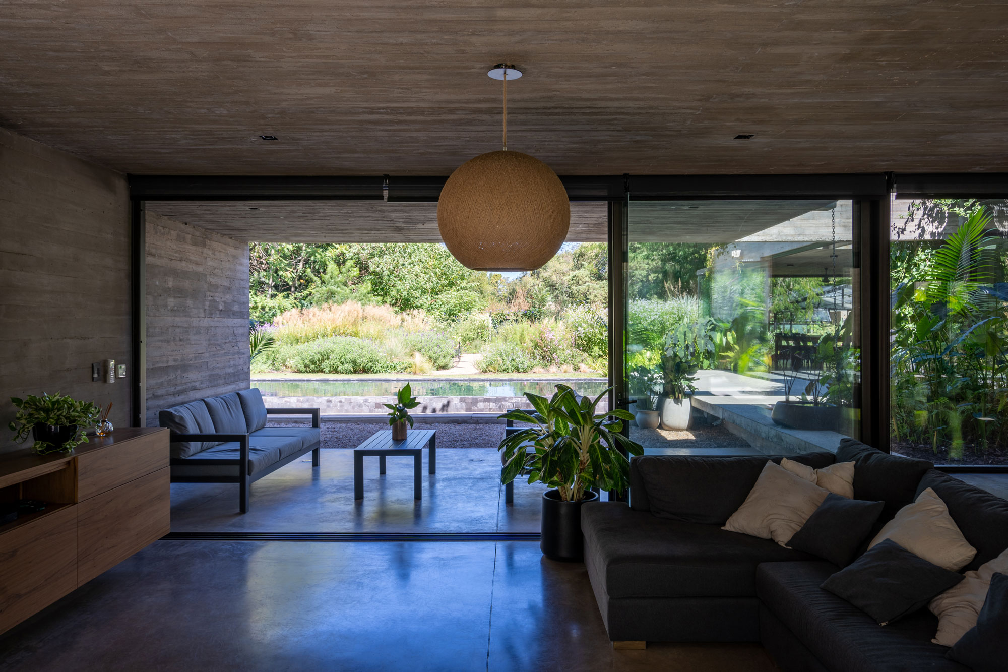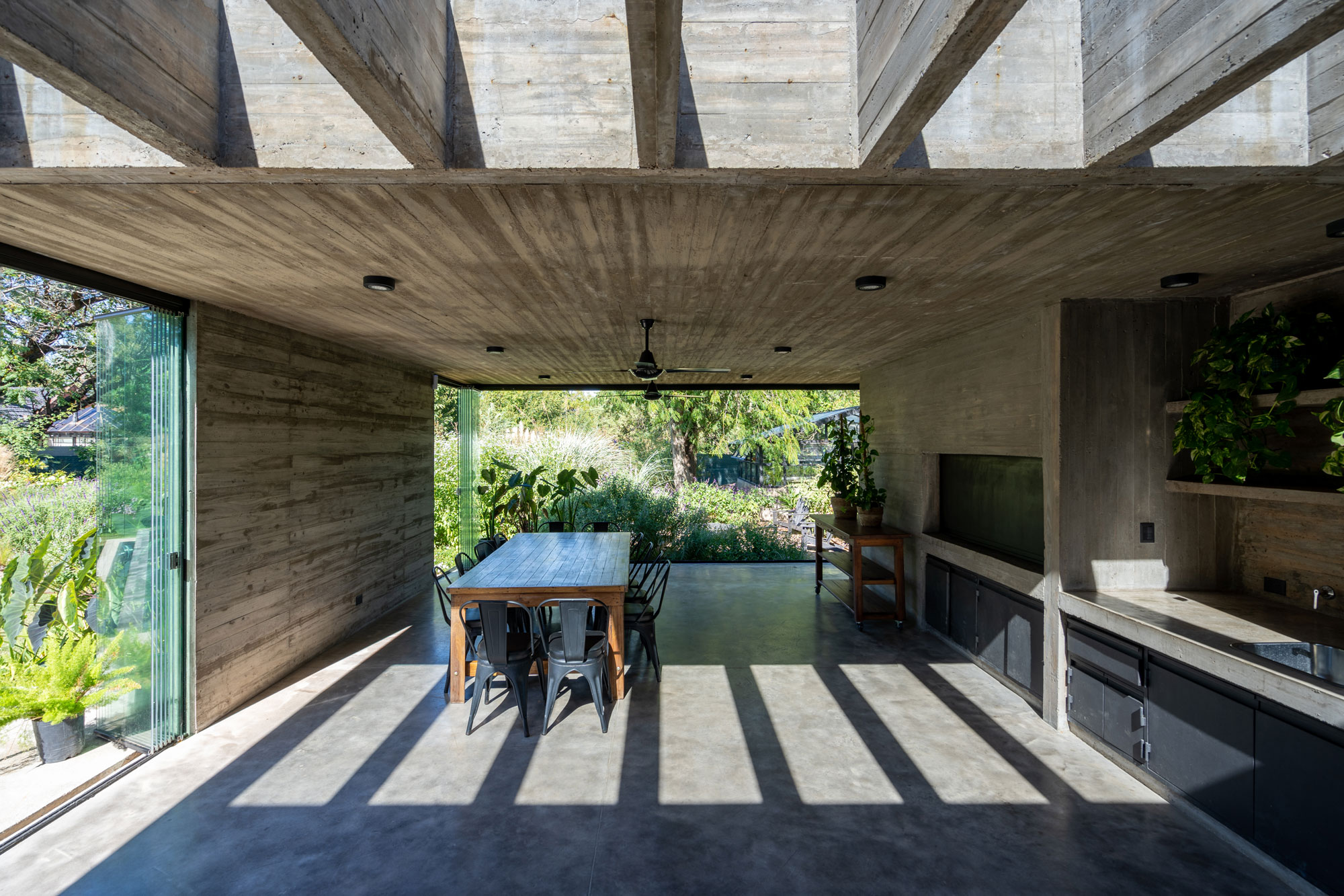 En el sector opuesto, y mediante un desnivel de tres escalones que permite una perspectiva elevada sobre la piscina y el terreno, se despliega el resto del programa: escritorio, comedor principal con expansión propia, y una cocina con barra integrada y conexión con el acceso de servicio. Esta última se vincula físicamente con el sector de parrilla a través de una continuidad de pérgolas que organizan el espacio exterior.