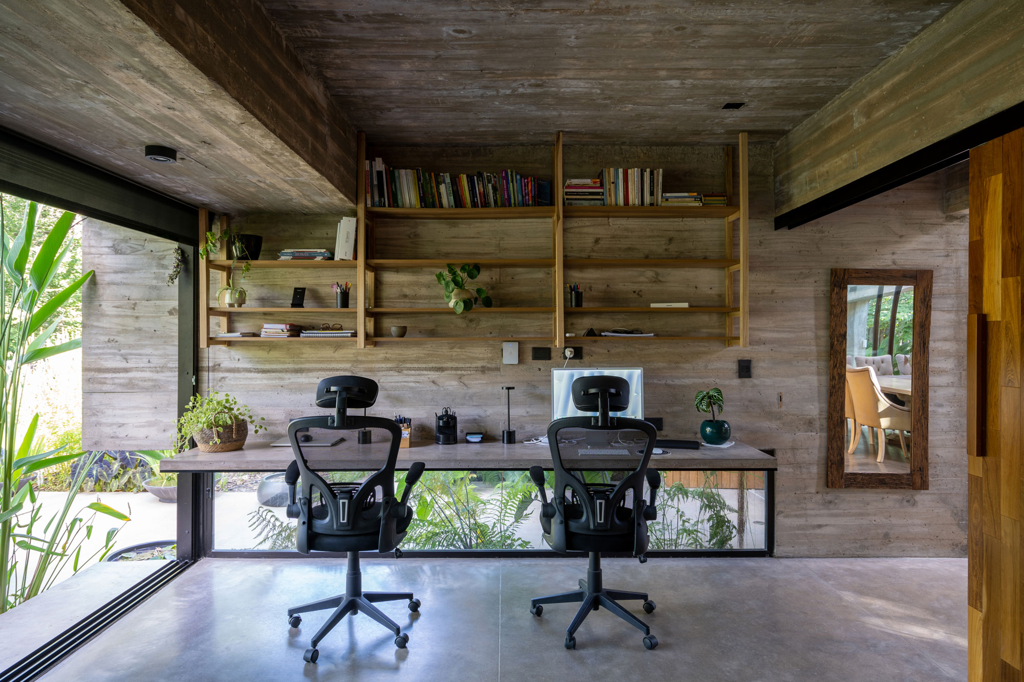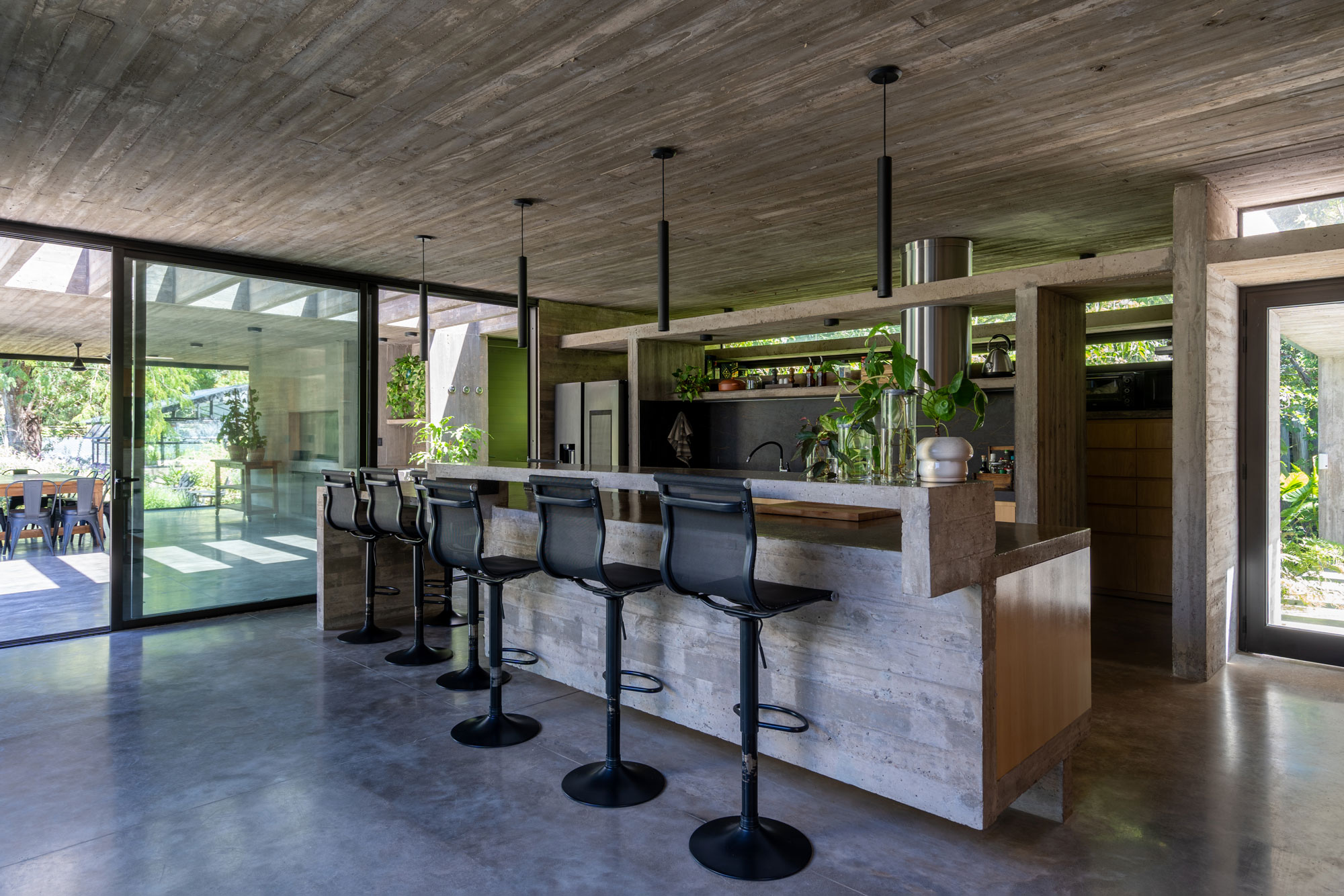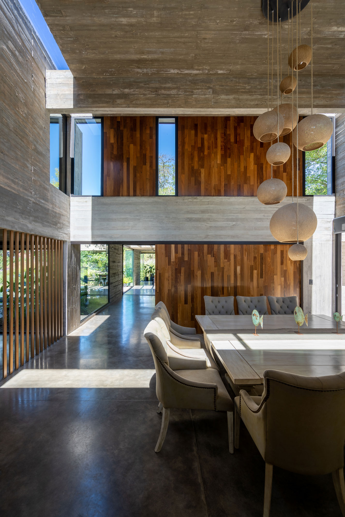 En el sector opuesto, y mediante un desnivel de tres escalones que permite una perspectiva elevada sobre la piscina y el terreno, se despliega el resto del programa: escritorio, comedor principal con expansión propia, y una cocina con barra integrada y conexión con el acceso de servicio. Esta última se vincula físicamente con el sector de parrilla a través de una continuidad de pérgolas que organizan el espacio exterior.