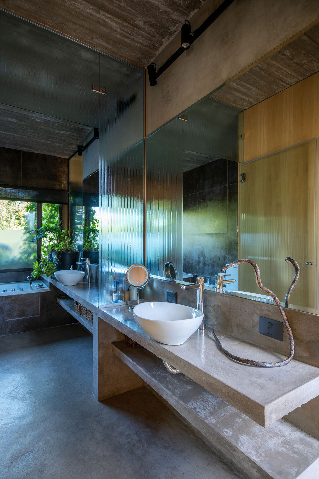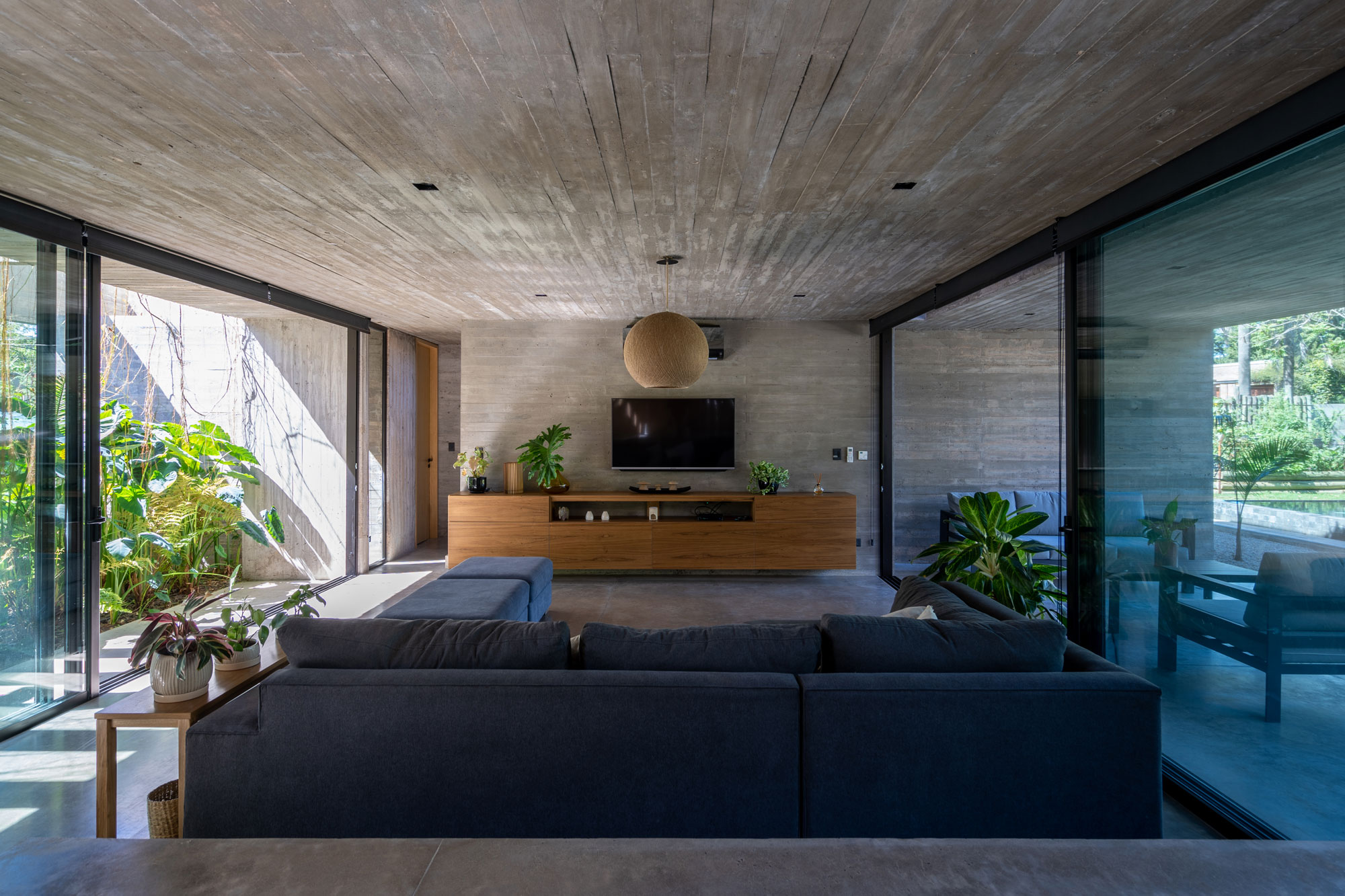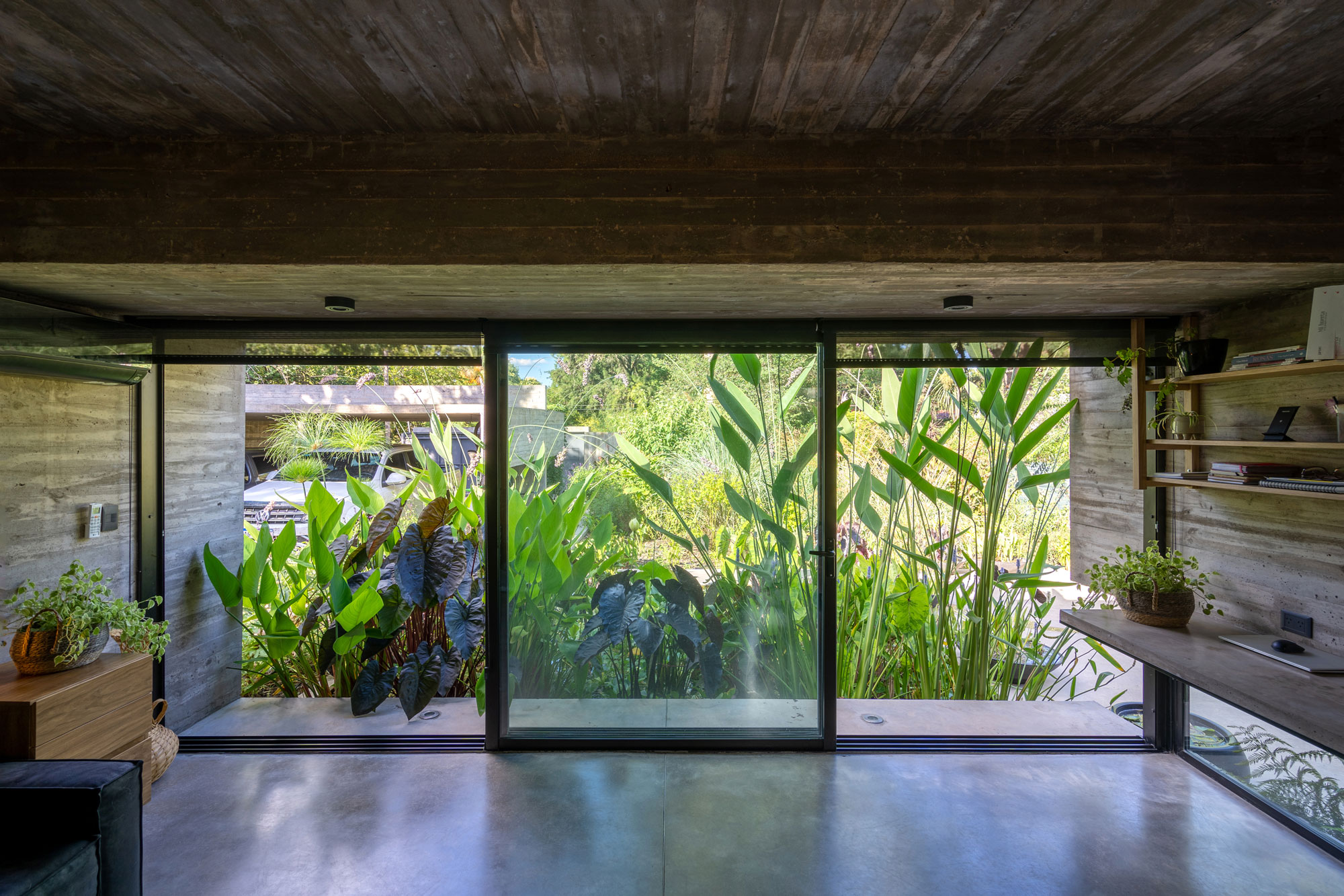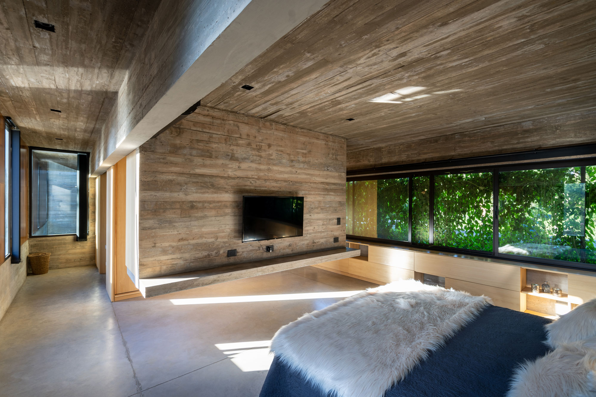 Se optó por el hormigón visto como material protagonista, buscando una síntesis formal que permitiera grandes aberturas sin apoyos intermedios. Esta decisión estructural no solo responde a una ética de honestidad material, sino que garantiza una continuidad visual ininterrumpida. El hormigón actúa como un marco atemporal que captura y destaca la naturaleza, diluyendo el límite entre el refugio construido y el exterior.