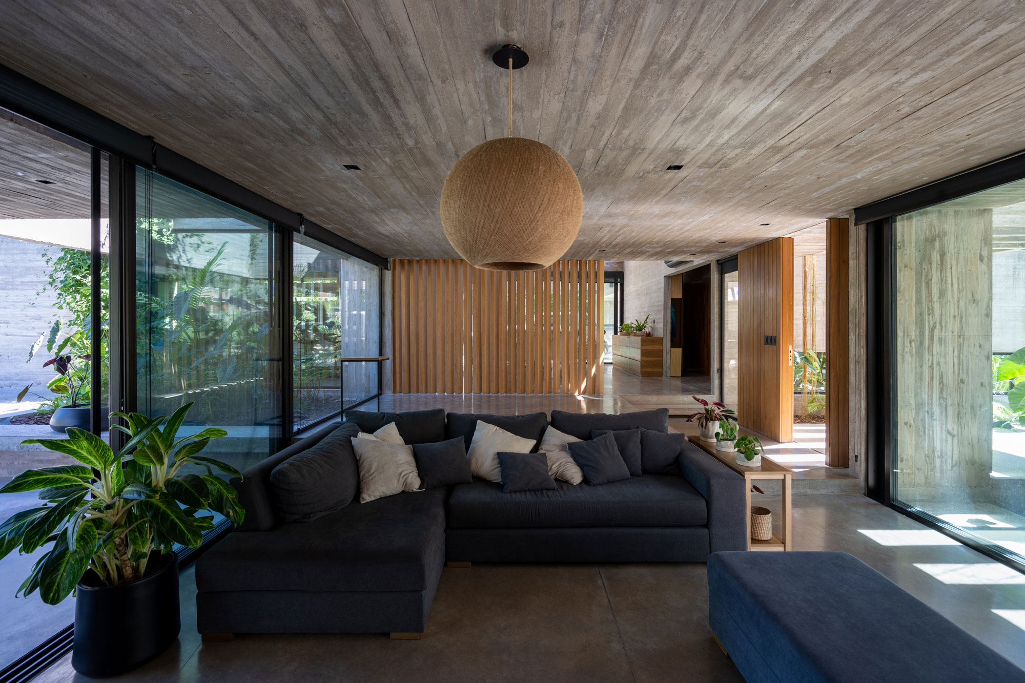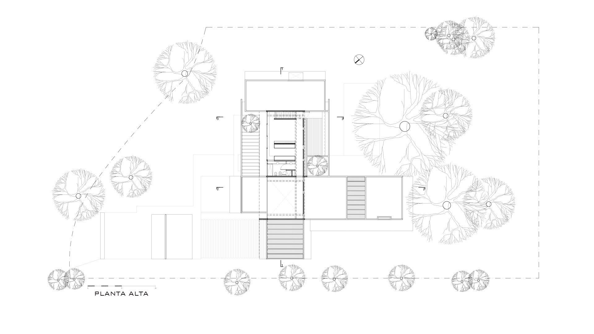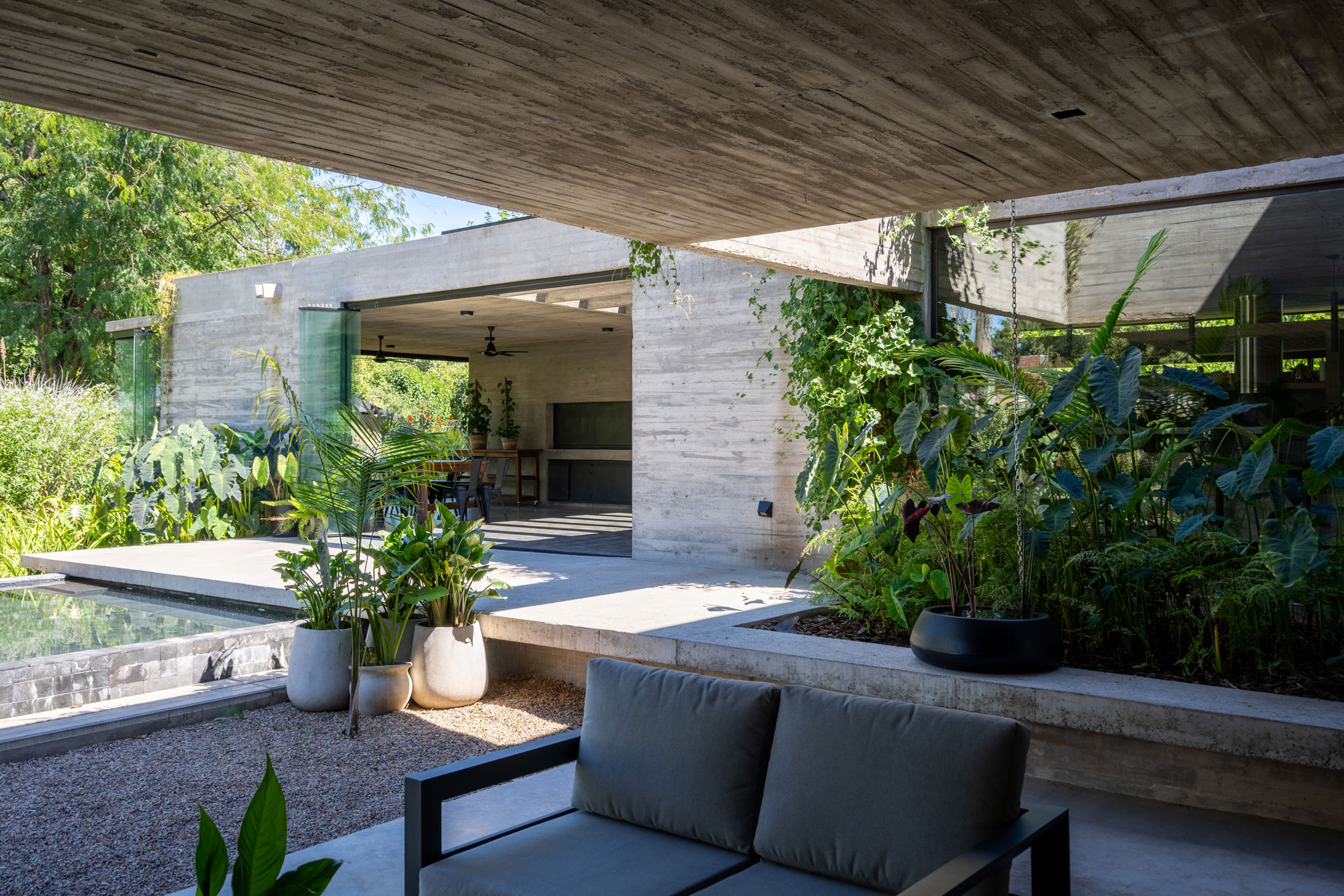 El acceso principal, jerarquizado por una pérgola y un jardín, introduce al área social. El estar se abre simultáneamente hacia los jardines del frente a través de una pérgola de hormigón que tamiza la luz y hacia una galería posterior con vistas a la piscina y al paisaje proyectado. Hacia el lateral izquierdo se ubica la escalera de acceso a la planta alta y el ala de los hijos organizada en tres dormitorios con baños privados.