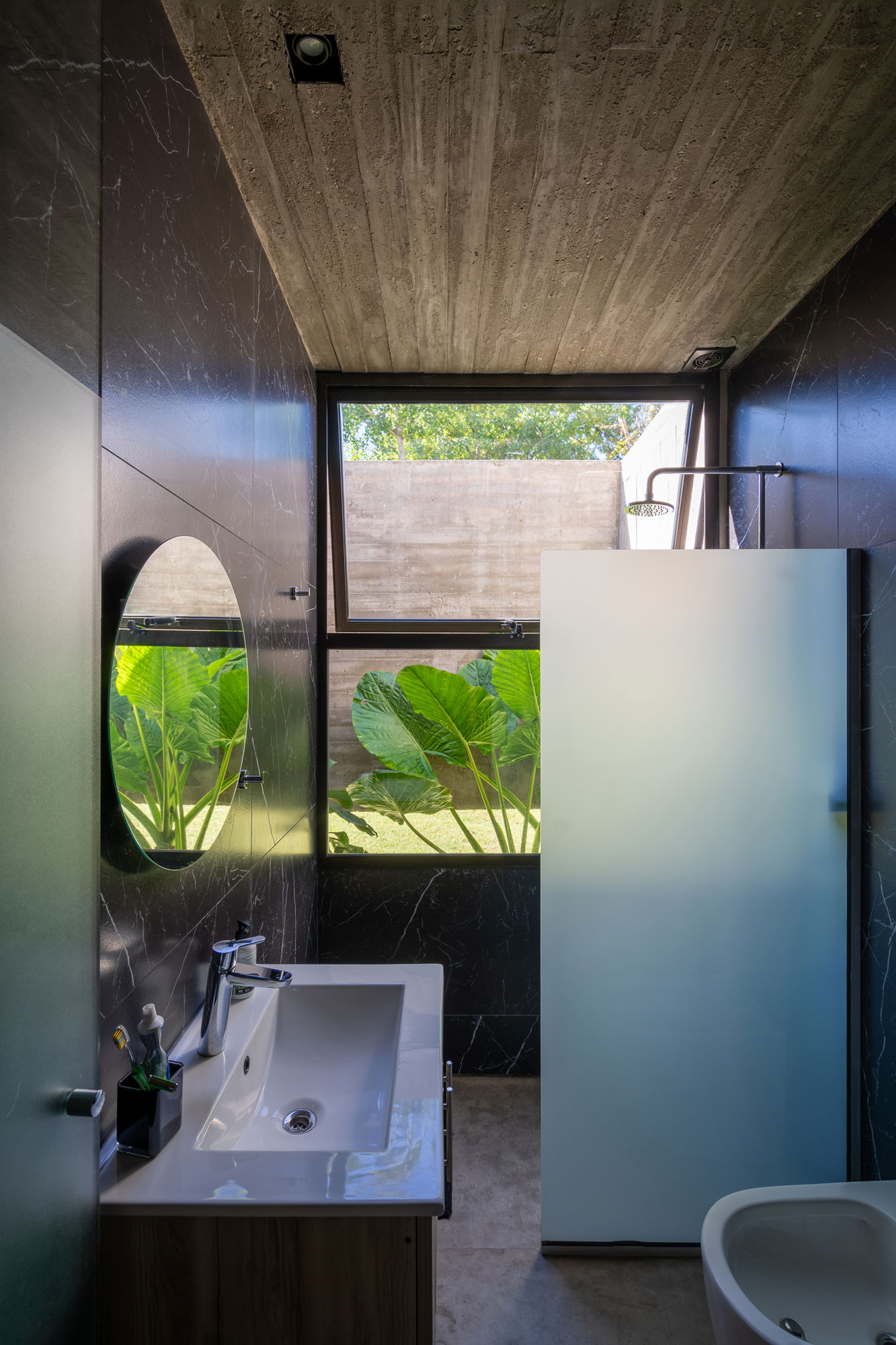 Este sistema de recorridos culmina en el ascenso hacia la suite principal. Ubicada en la planta alta como un prisma independiente, este nivel se configura como un volumen con frente totalmente vidriado, protegido de la mirada pública por un jardín elevado que actúa como fuelle visual. En contraste, su fachada oeste se resuelve como un muro ciego, aislado térmicamente y revestido en madera, reforzando su carácter de refugio hermético y privado.