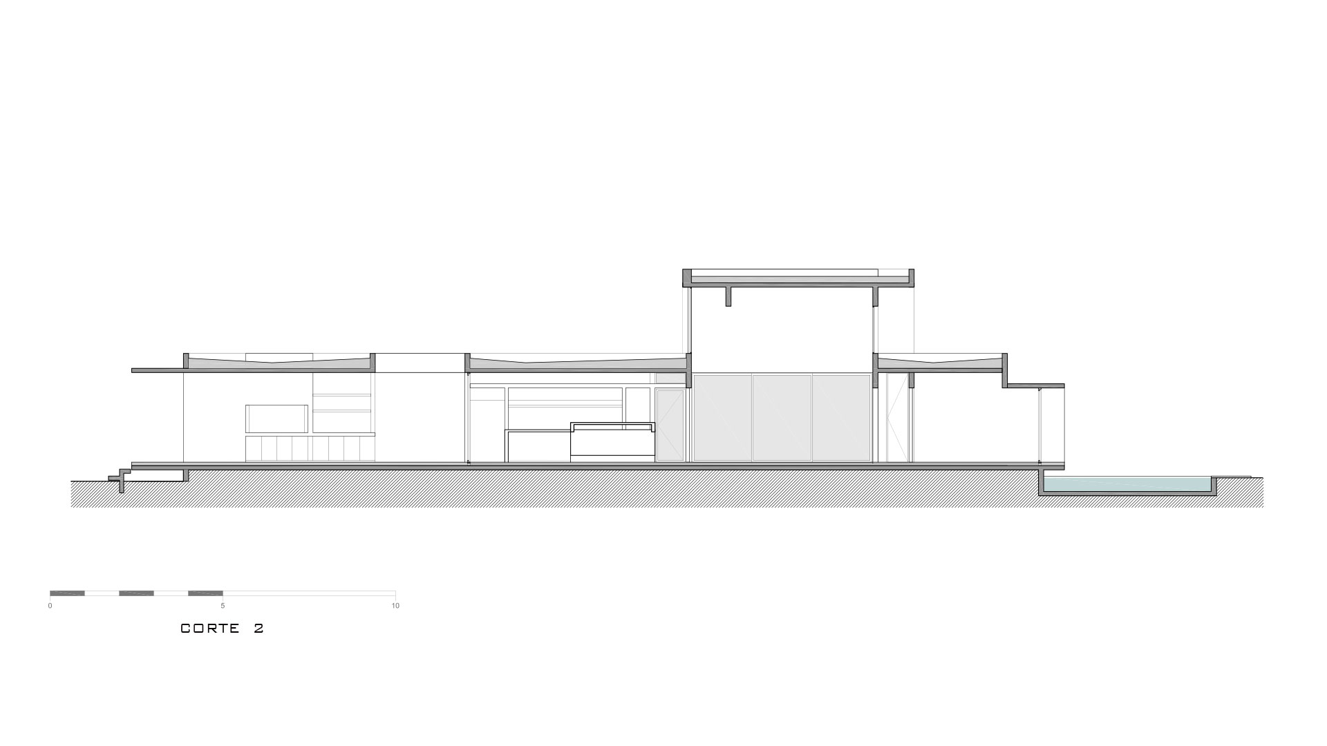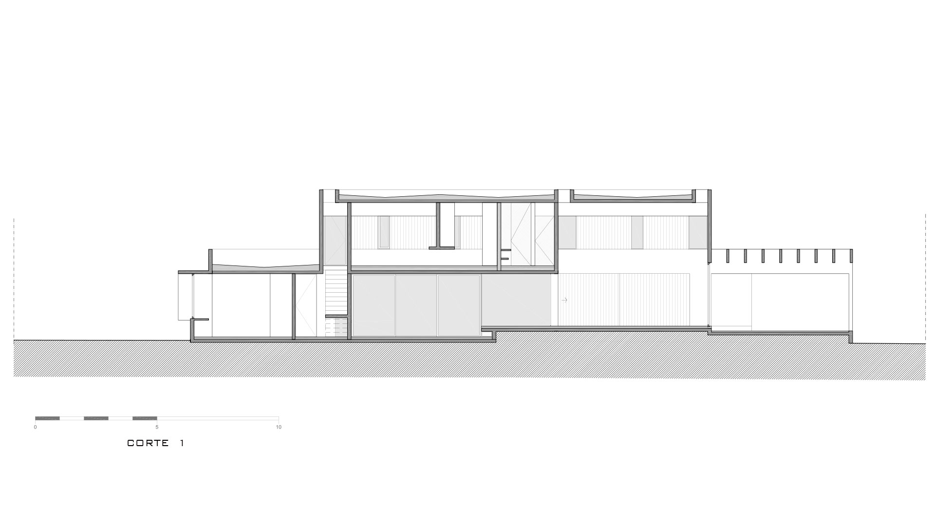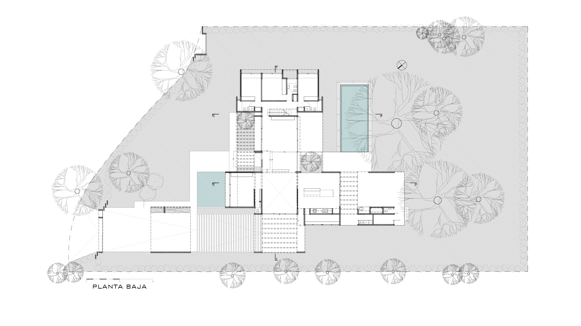 El encargo planteaba el desafío de resolver una vivienda que albergara la intensa actividad social de una familia con tres hijos adolescentes, garantizando al mismo tiempo la independencia de cada integrante. Bajo esta premisa, la propuesta se desarrolla mayoritariamente en planta baja, asegurando el contacto directo de todos los ambientes con los jardines. El programa se organiza en dos alas que abrazan el terreno, separando el área social del sector privado de los hijos mediante desniveles y patios verdes.