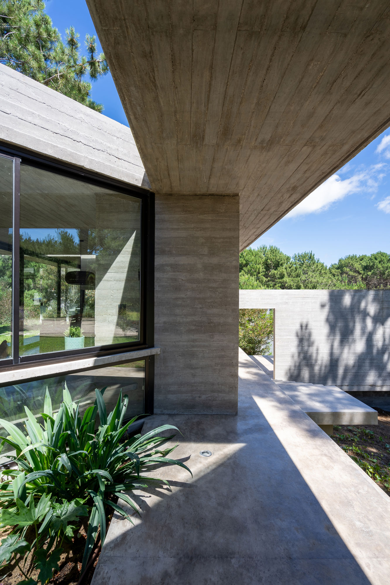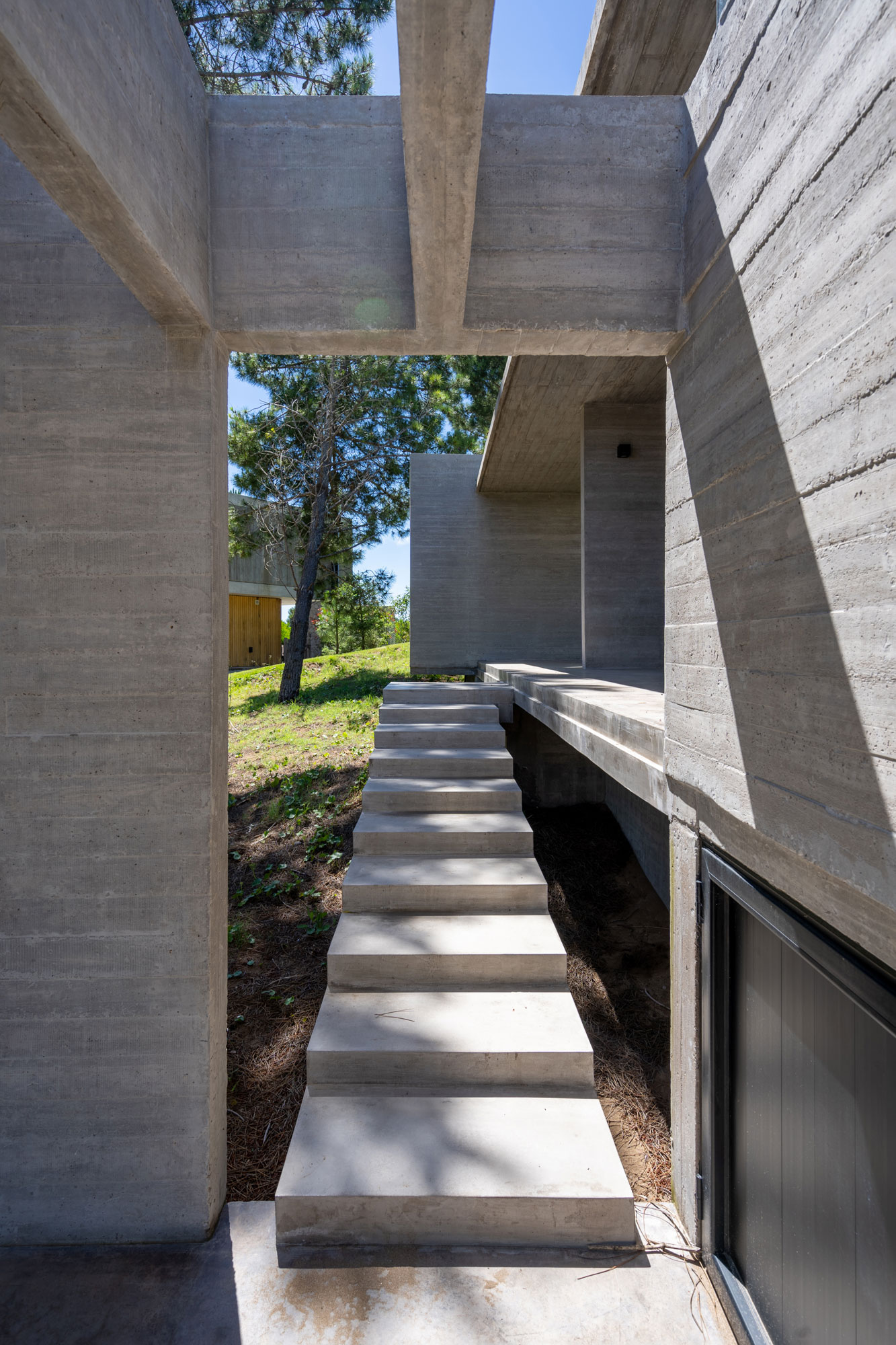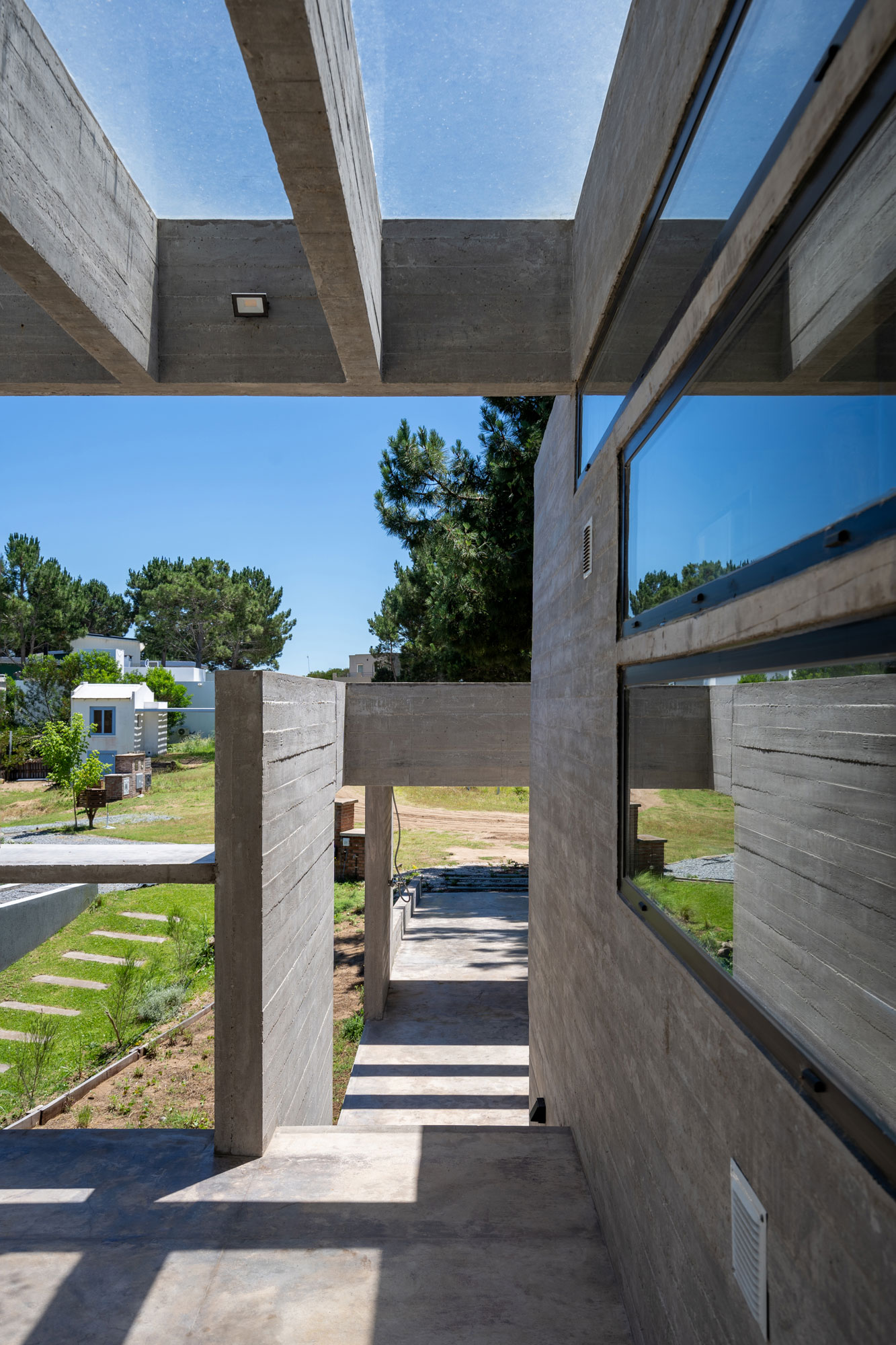 En nuestro estudio, concebimos la luz natural no solo como un requisito funcional, sino como un material de proyecto que aporta riqueza espacial. Las aberturas no son elementos estandarizados, sino horadaciones estratégicas que difuminan la frontera entre el interior y el exterior. En Casa Senderos, el juego de perforaciones, las pérgolas de hormigón y las aberturas cenitales crean atmósferas cambiantes que enmarcan el bosque y dotan de dinamismo a cada ambiente.