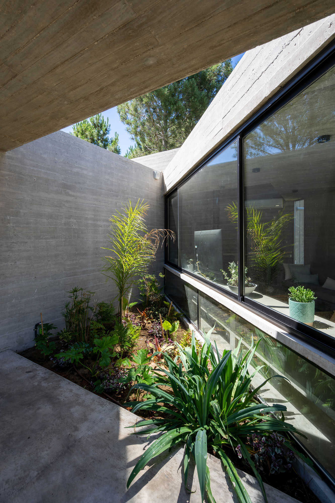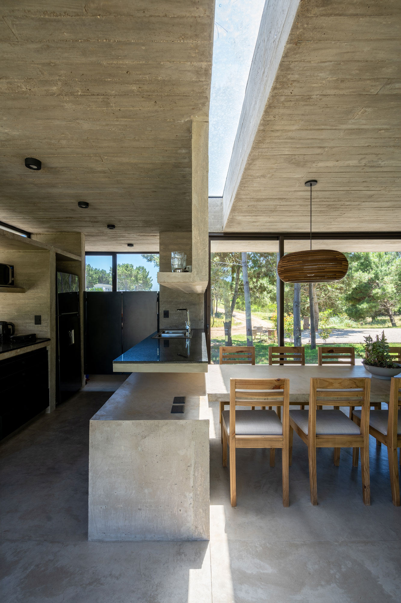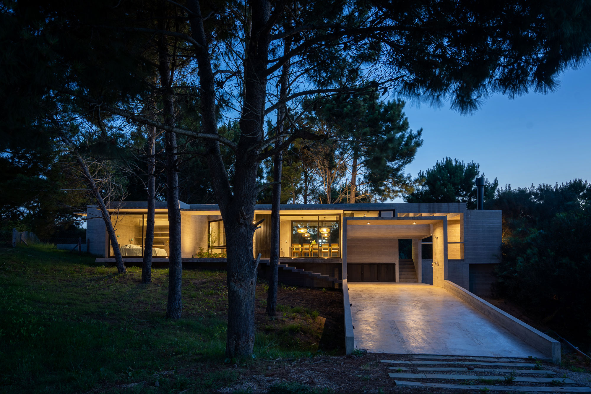 En nuestro estudio, concebimos la luz natural no solo como un requisito funcional, sino como un material de proyecto que aporta riqueza espacial. Las aberturas no son elementos estandarizados, sino horadaciones estratégicas que difuminan la frontera entre el interior y el exterior. En Casa Senderos, el juego de perforaciones, las pérgolas de hormigón y las aberturas cenitales crean atmósferas cambiantes que enmarcan el bosque y dotan de dinamismo a cada ambiente.