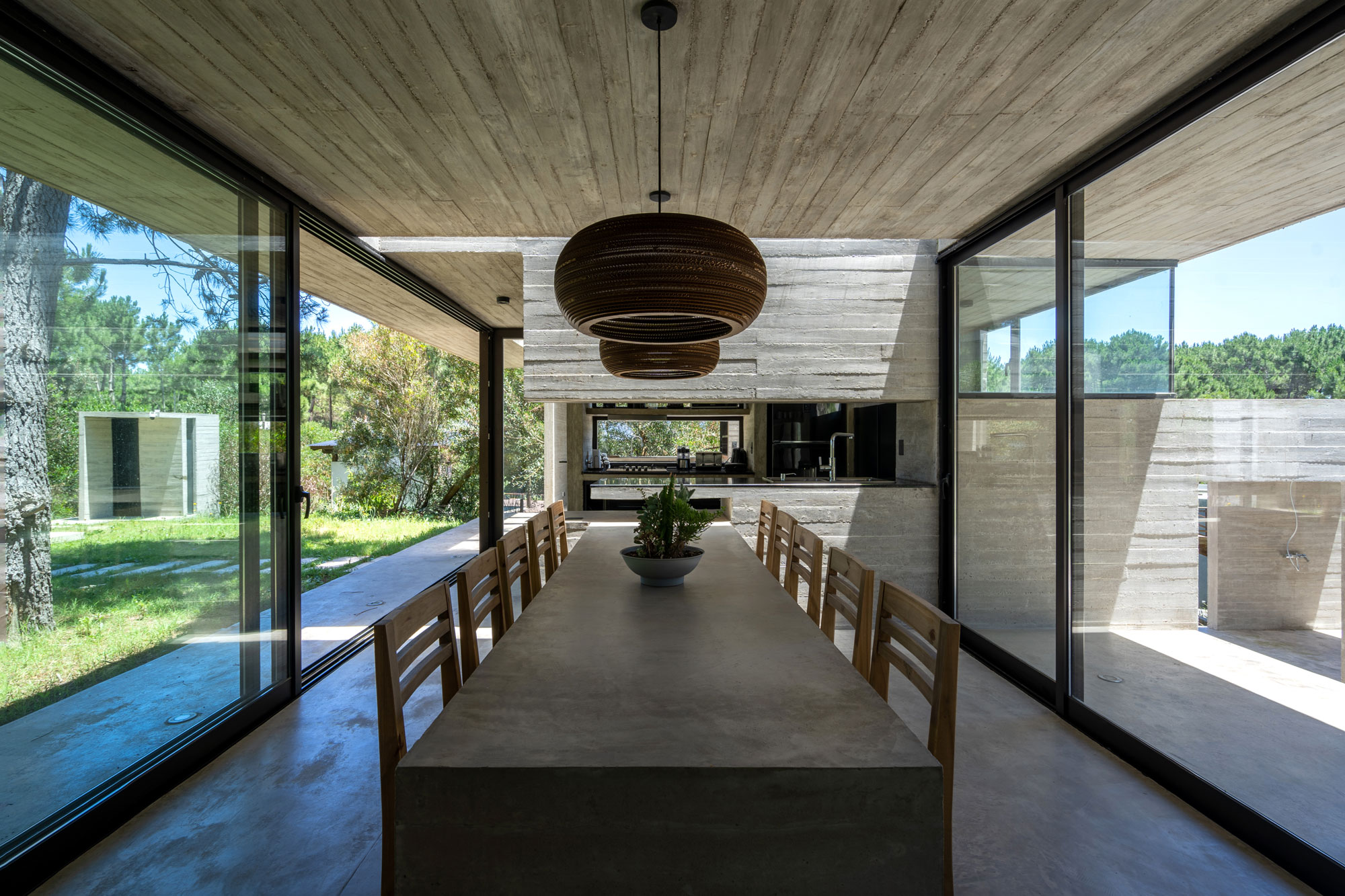 La planta se acomoda orgánicamente entre los árboles, definiendo dos sectores claros. Hacia la derecha, el comedor y la cocina se integran en franca relación con una pérgola de hormigón para el uso al aire libre. Hacia la izquierda, el estar se percibe más recogido, en contacto visual con un patio íntimo. Acompañando la elevación del médano, los dormitorios se desarrollan en tres volúmenes independientes, garantizando privacidad y perspectivas singulares del paisaje.