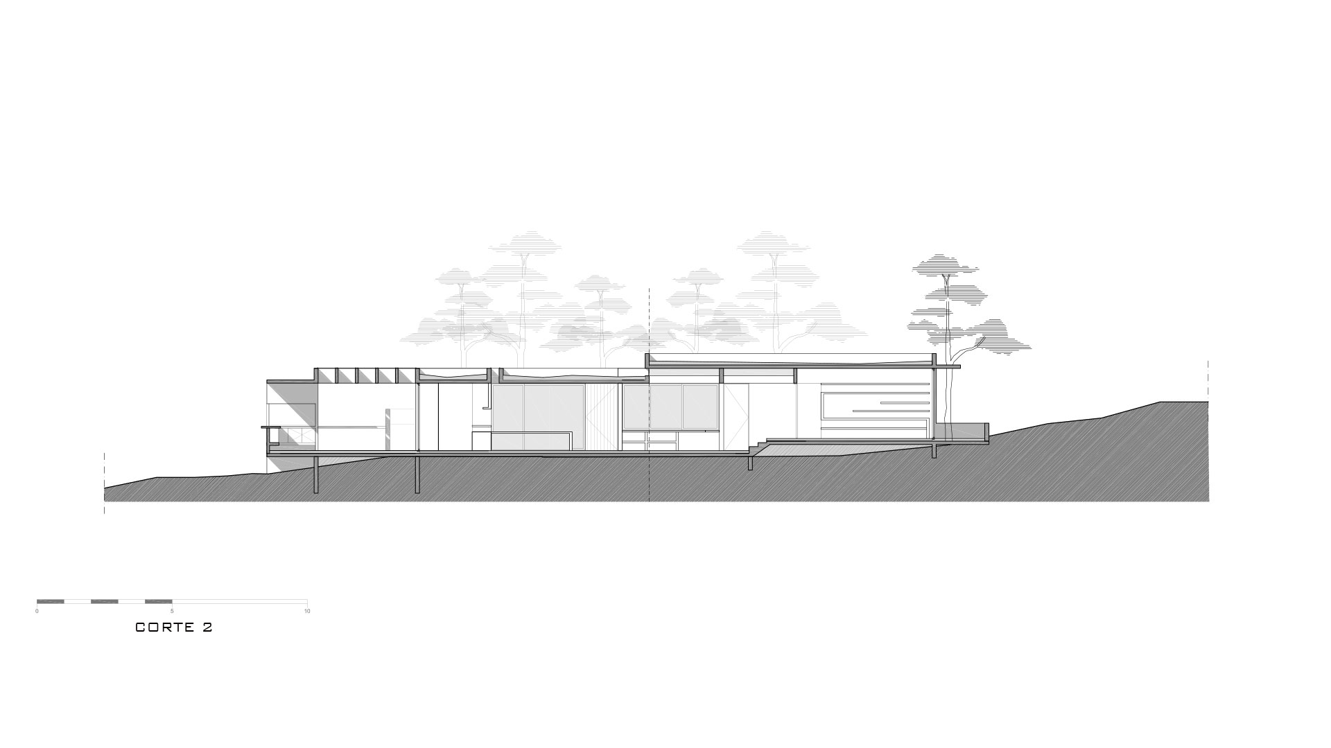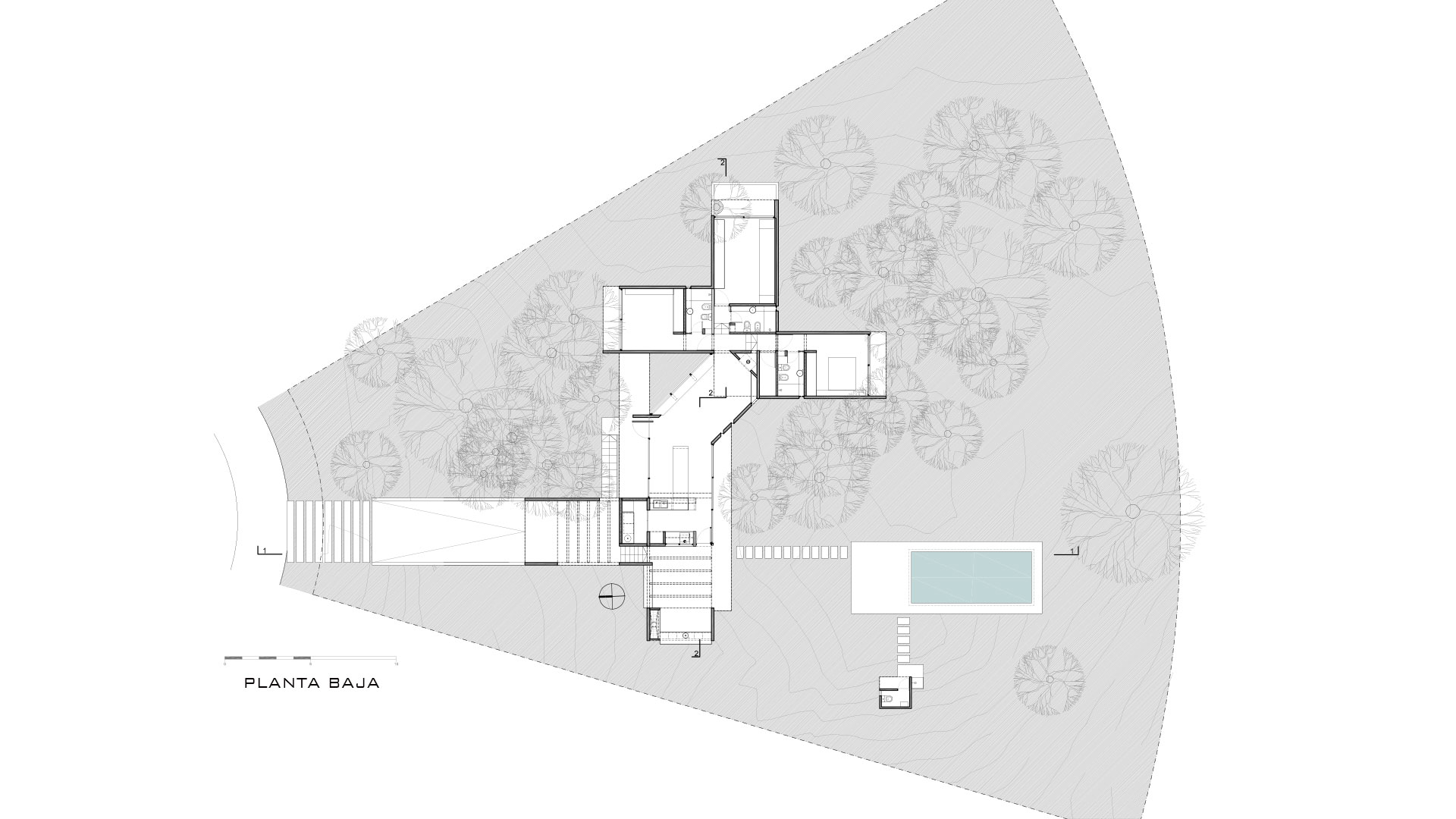 El lote presenta una geometría particular en forma de sector circular, con un frente estrecho de 12 metros que se expande hacia el fondo hasta alcanzar los 53 metros, lindando con una reserva forestal. La topografía presentaba un desafío adicional: una depresión próxima al acceso seguida de una elevación de 2.50 metros, para luego descender abruptamente hacia la zona de la reserva.