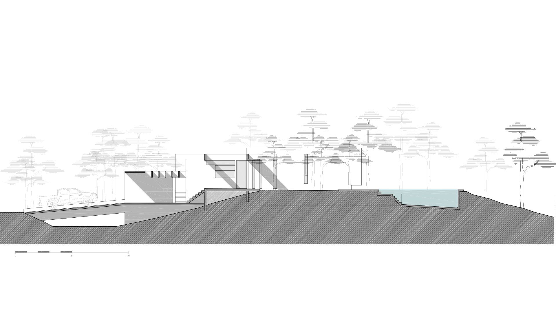 Para respetar la topografía y la masa arbórea existente, se propuso un acceso mediante un puente con pendiente que salva el desnivel inicial y define el garaje semicubierto. Desde este punto, el recorrido se bifurca: una escalera de suave pendiente conduce al área social, mientras que una vía secundaria conecta con el sector de parrilla y el resto del lote.
